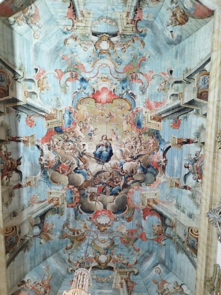 Na podstavci, ktorý pripomína viac schody stojí socha Panny Márie, ktorej je kostol zasvätený. Aby sme našli ďalší zaujímavý atribút kostola, musím zakloniť hlavu a pozrieť sa na strop. Na drevenom strope je obrovská maľba zobrazujúca výjav z biblie.