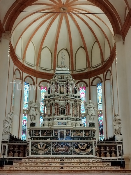 No pri bližšom skúmaní som našiel bohaté dekorácie. Samotný oltár je obrovské umelecké dielo vyrobené z farebného mramoru. Farebnosť mramoru mi mierne pripomína baziliku z Florencie. Bočné kaplnky sú taktiež veľkým umeleckým dielom nikoho iného ako dielom samotného Palladia. Je zaujímavé, že v kostole sa spája renesancia s gotikou v silnej harmónií.